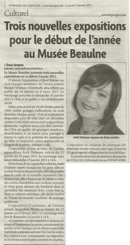 2011 Janvier « Trois nouvelles expositions pour le début de l’année au Musée Beaulne », Dany Jacques, Le Progrès de Coaticook, Coaticook