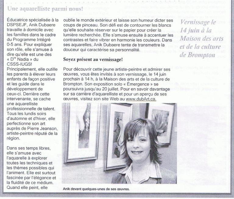 2008 Mai « Une aquarelliste parmi nous! », Journal La Missive, CSSS-IUGS, Sherbrooke