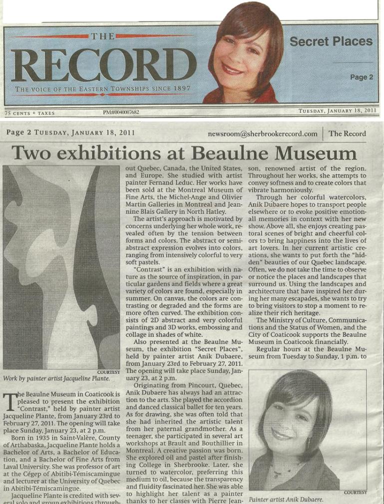 2011 Janvier « Two exhibitions at Beaulne Museum », Journal The Record, Sherbrooke