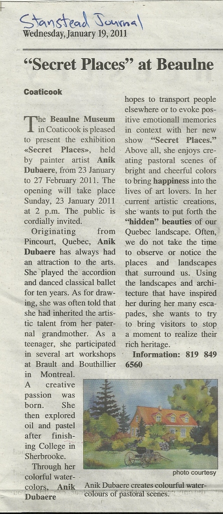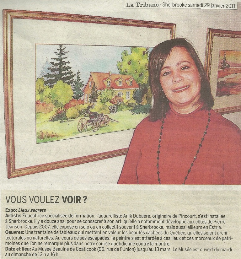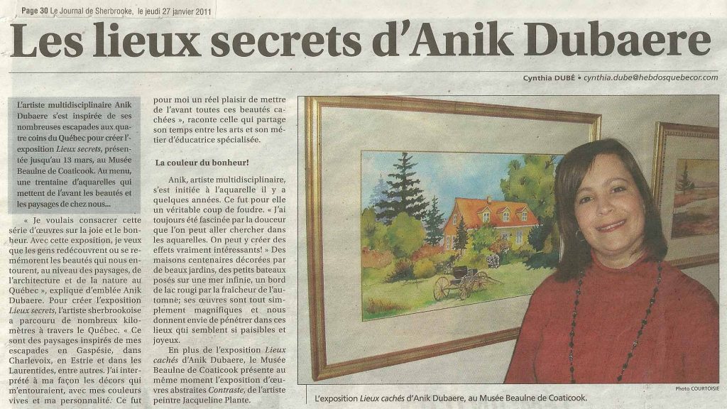 2011 Janvier « Les lieux secrets d’Anik Dubaere », Cynthia Dubé, Journal de Sherbrooke et Magog